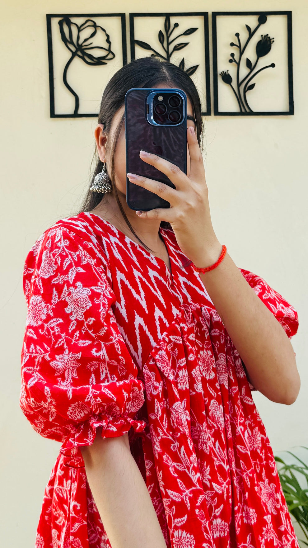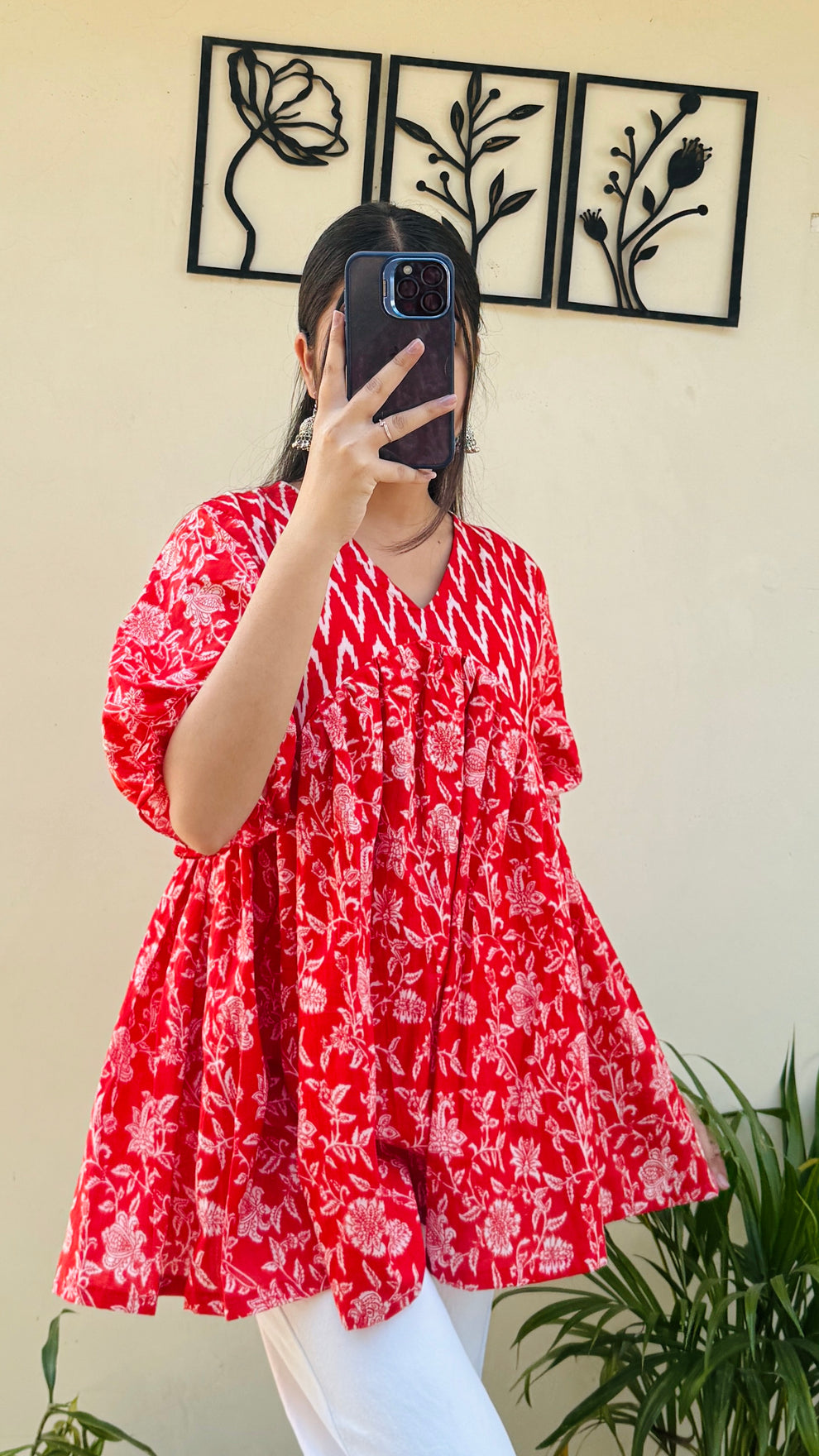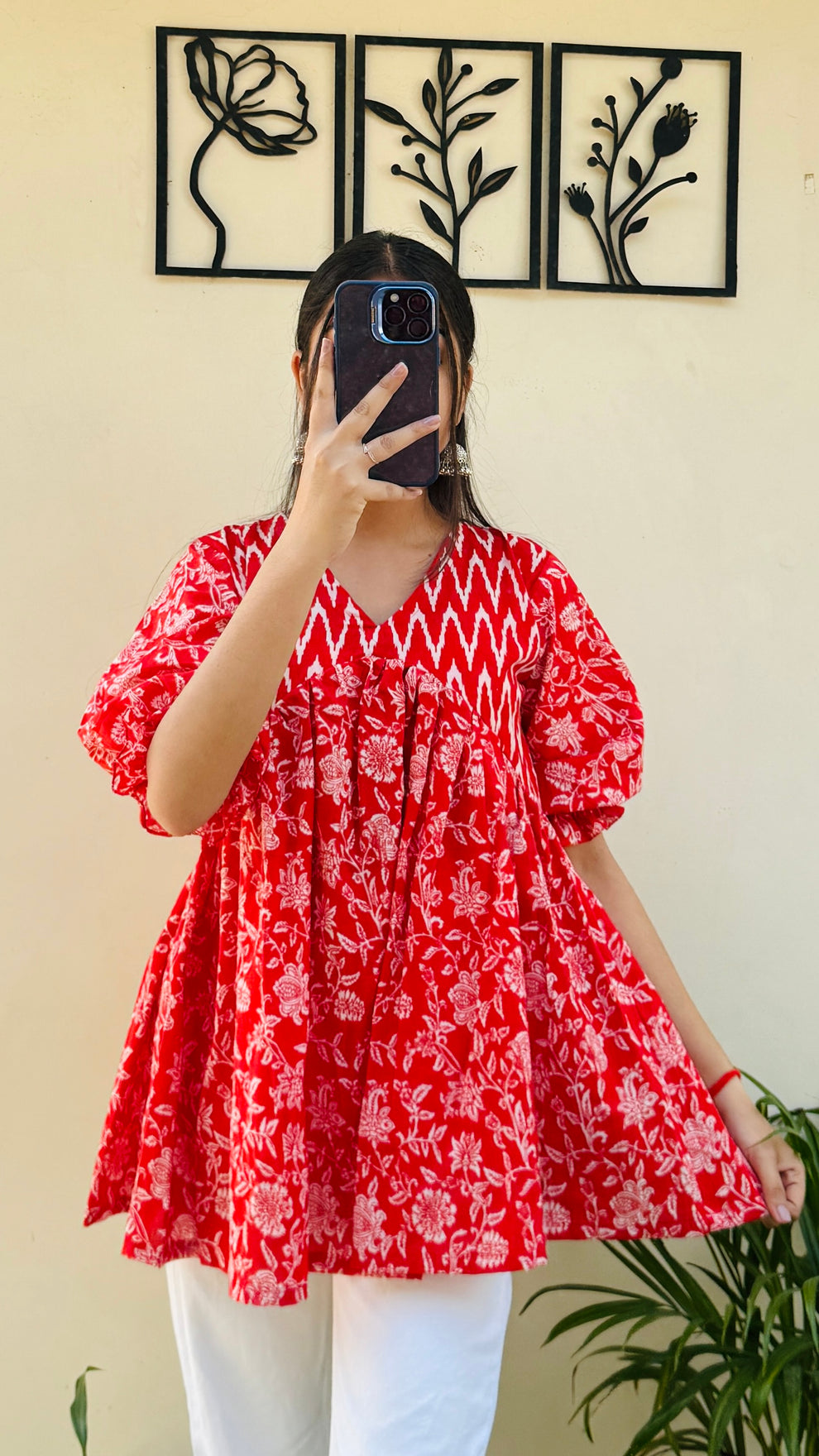 Cotton Flared Puff Sleeves Red Aliacut Floral Print Peplum Top