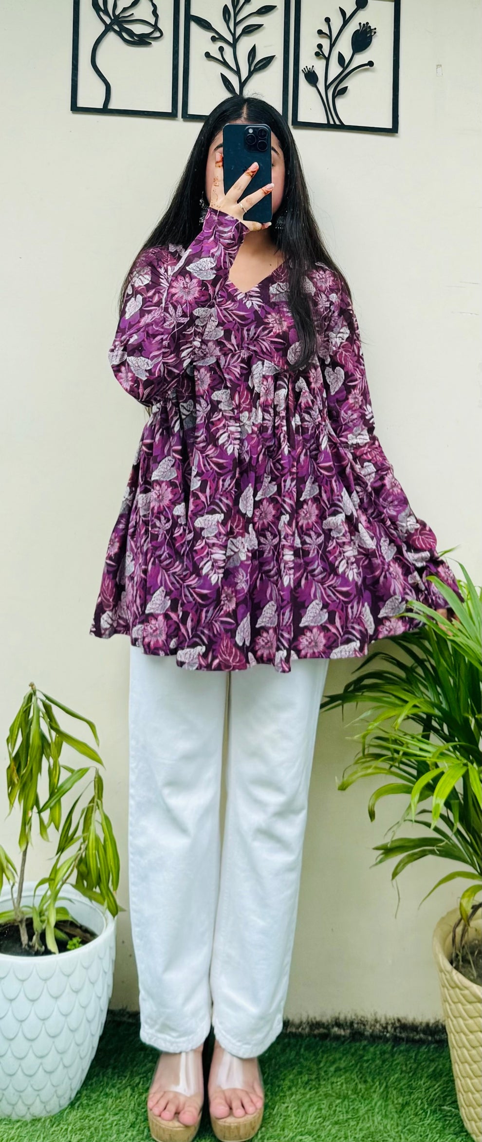 Cotton Wine Flared Floral Print Aliacut Peplum Top